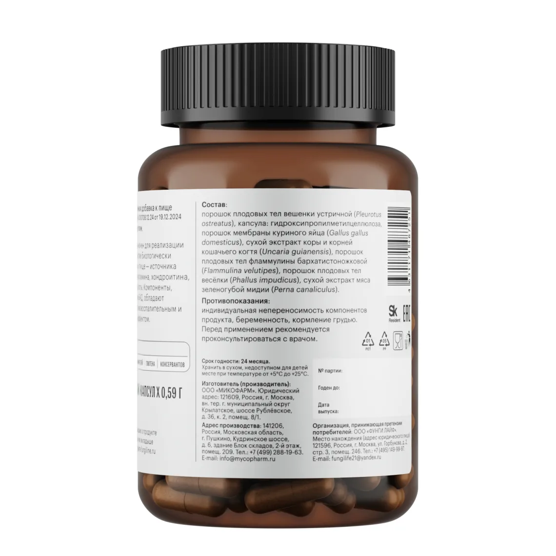 Мембрана куриного яйца — естественный источник хондроитина, который играет ключевую роль в поддержании прочности и эластичности суставных поверхностей. Экстракт зеленогубой мидии дополнительно питает хрящевую ткань, способствуя ее восстановлению и помогая предотвращать дегенеративные изменения.